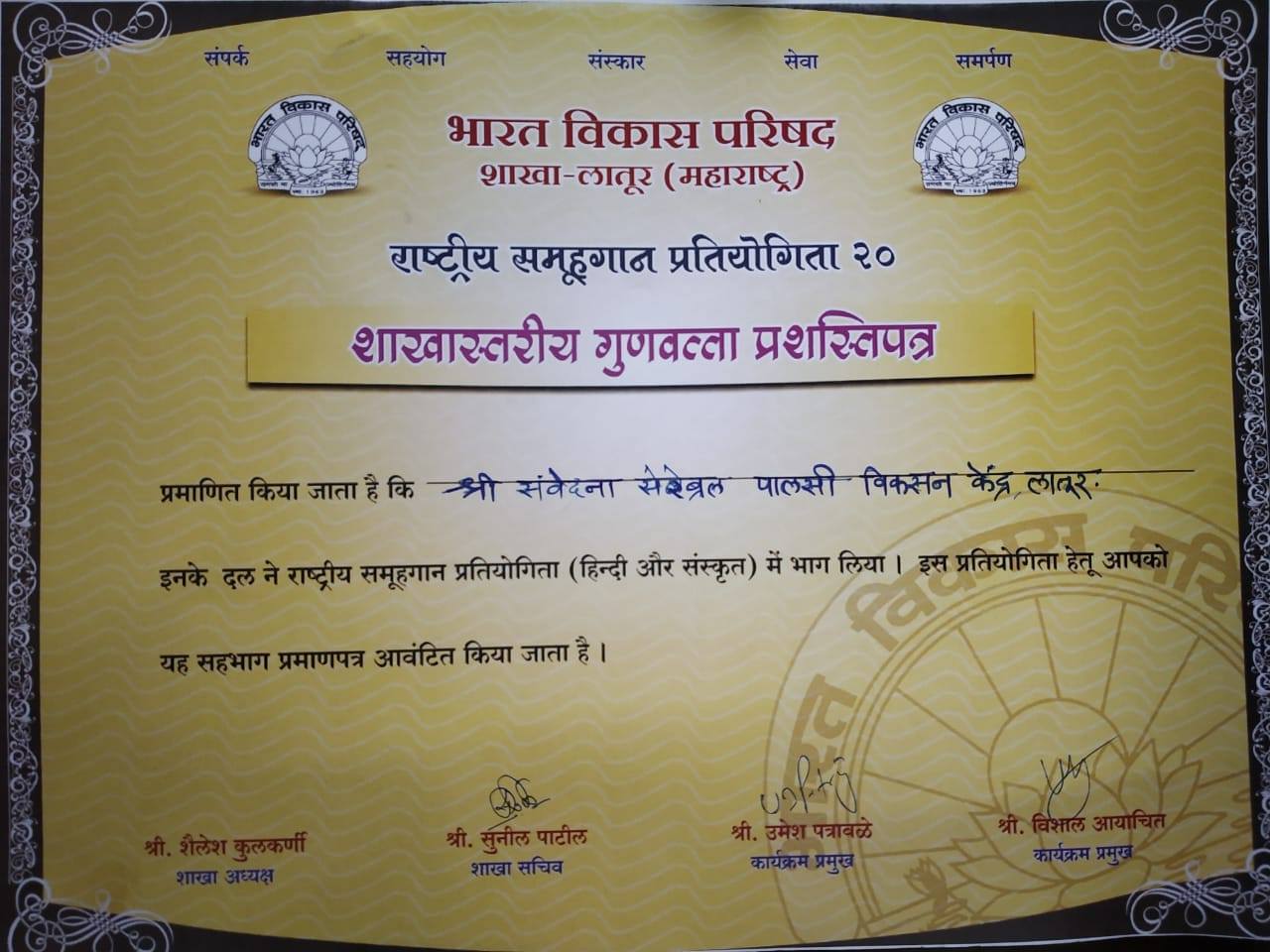 भारत विकास परिषद शाखा - लातूर आयोजित राष्ट्रीय समुहगान प्रतियोगिता या गीतगायन स्पर्धेत संवेदना शाळेतील विद्यार्थ्यांनी सहभाग घेवून उत्तेजनार्थ बक्षीस संपादन केले